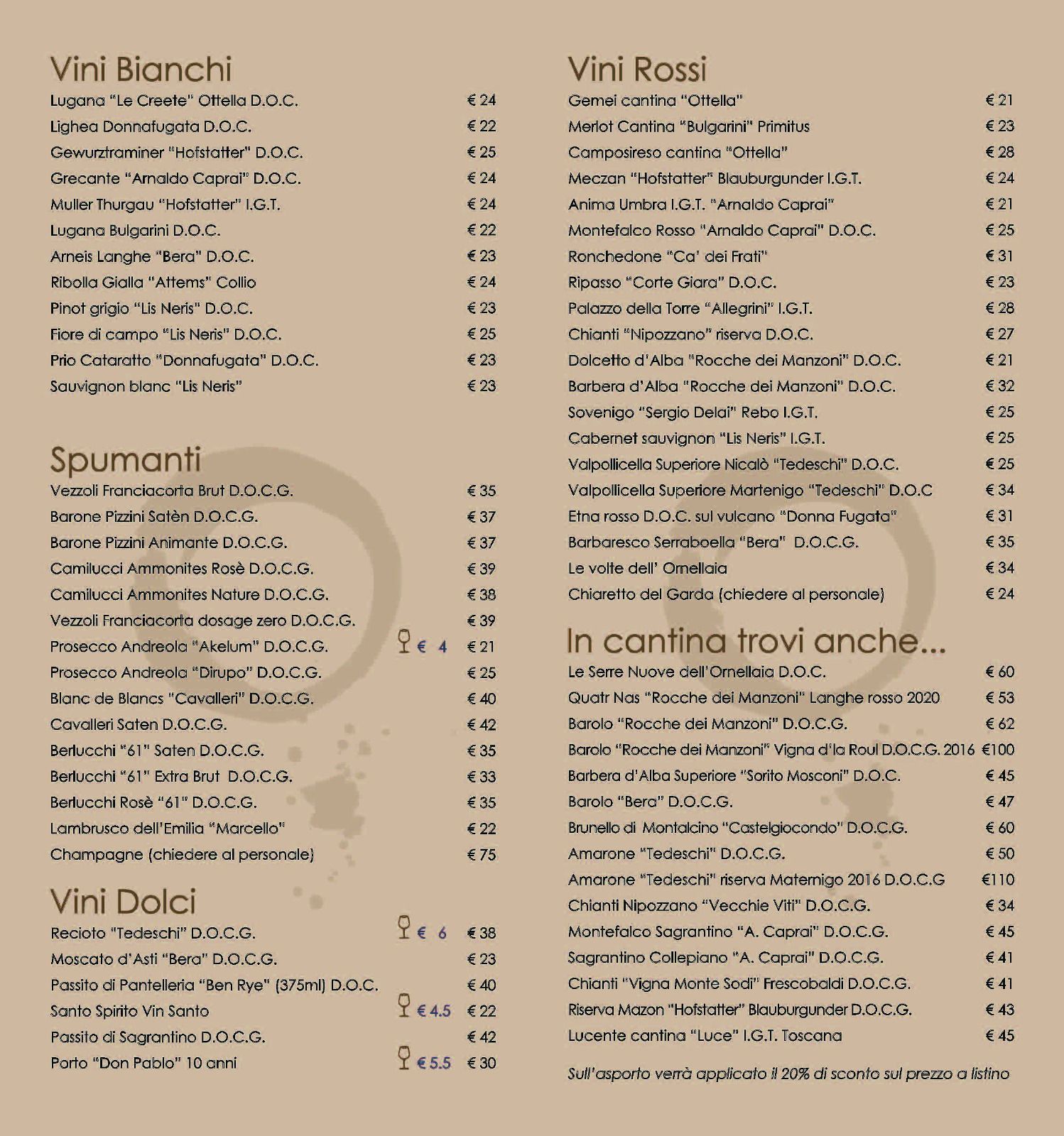 Informiamo i gentili clienti che oltre ai vini elencati nel menù, sono disponibili altri vini